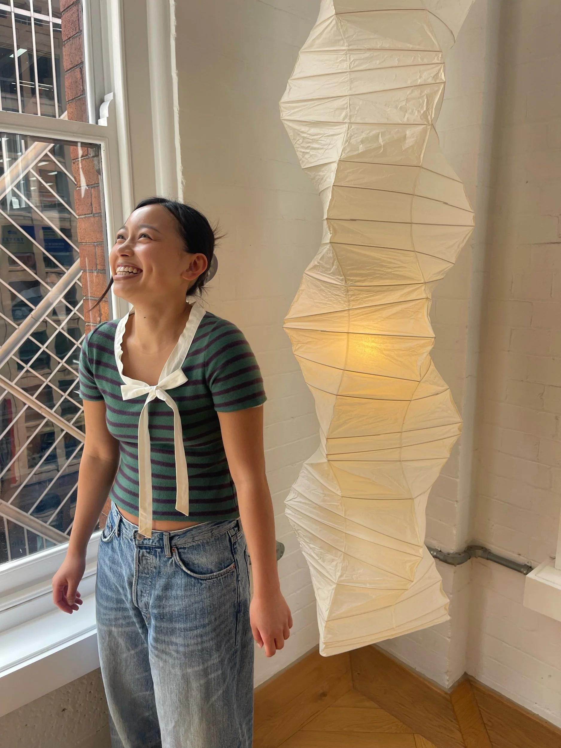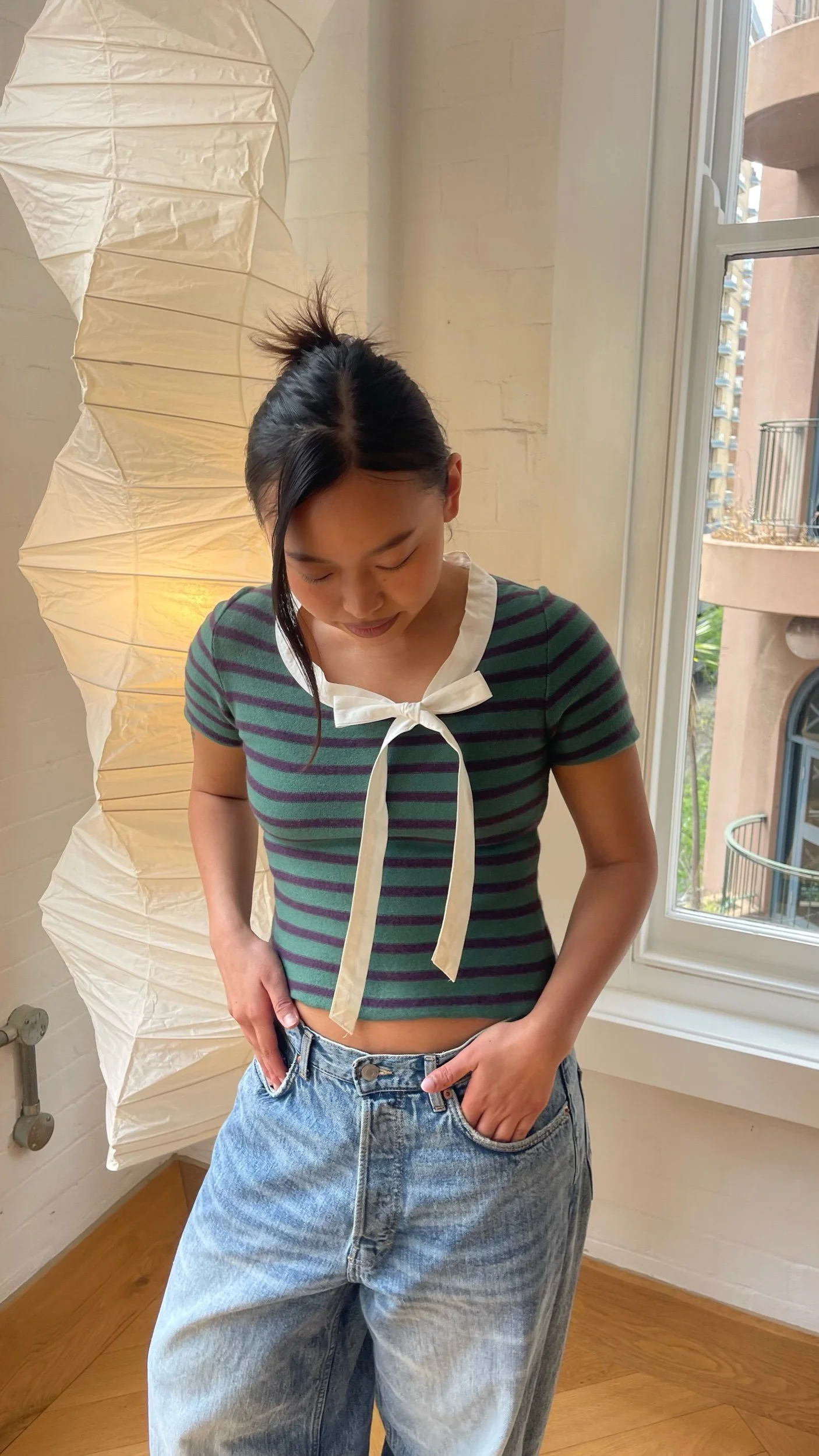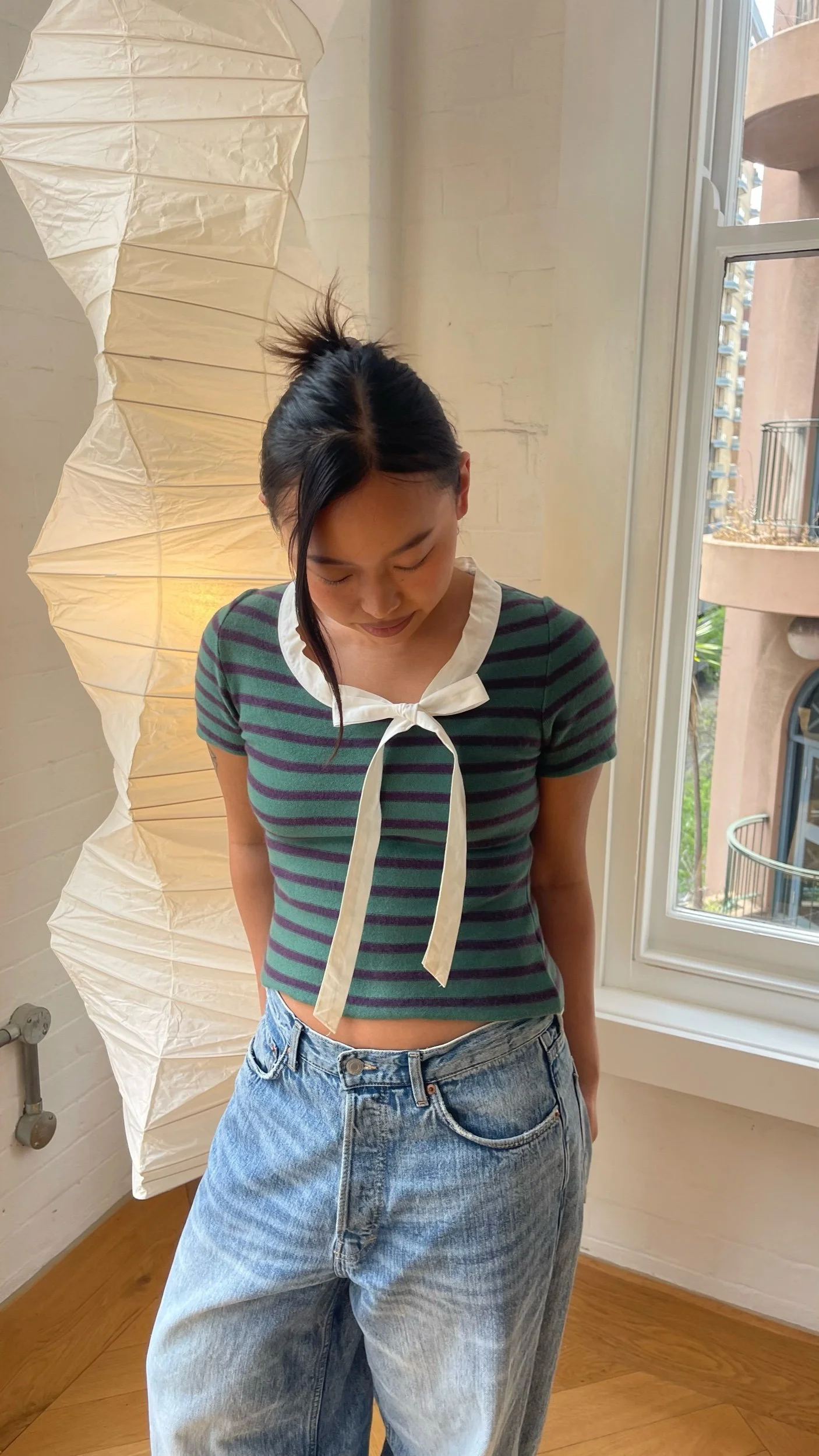 From the Castiglioni era, this 2000s Marni striped cashmere knit is a perfect reflection of the brand’s playful yet refined essence. The green and plum stripes create a bold, rhythmic palette, while the ivory cotton bow at the neckline adds that unmistakable Marni twist; quirky, charming, and instantly memorable. Under Consuelo Castiglioni’s vision, Marni became known for transforming everyday staples into artful, collectible pieces, and this knit captures that joyfully offbeat energy that makes her work so enduring. Great vintage condition, some discolouration on the back of the neckline, not noticeable when worn.
