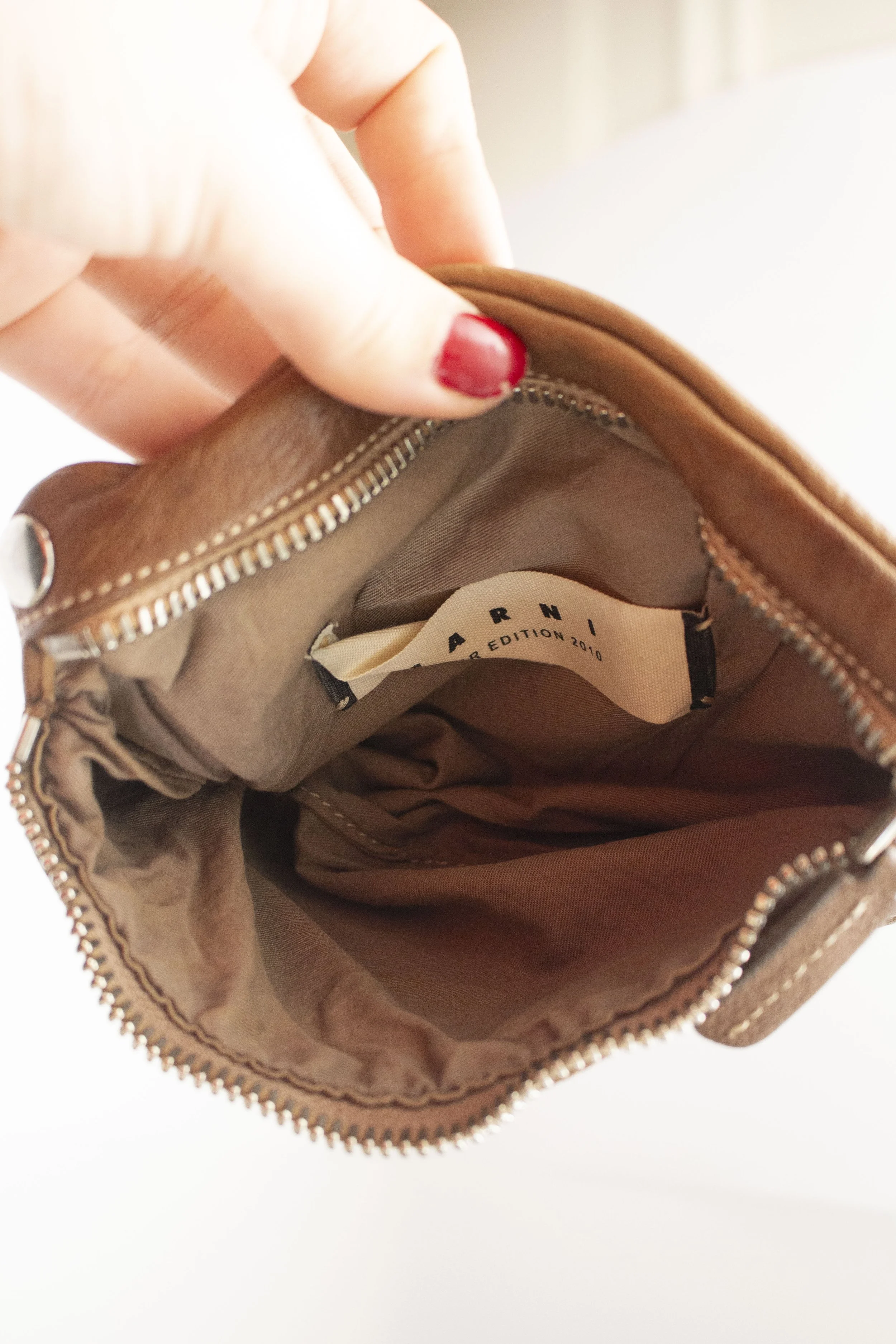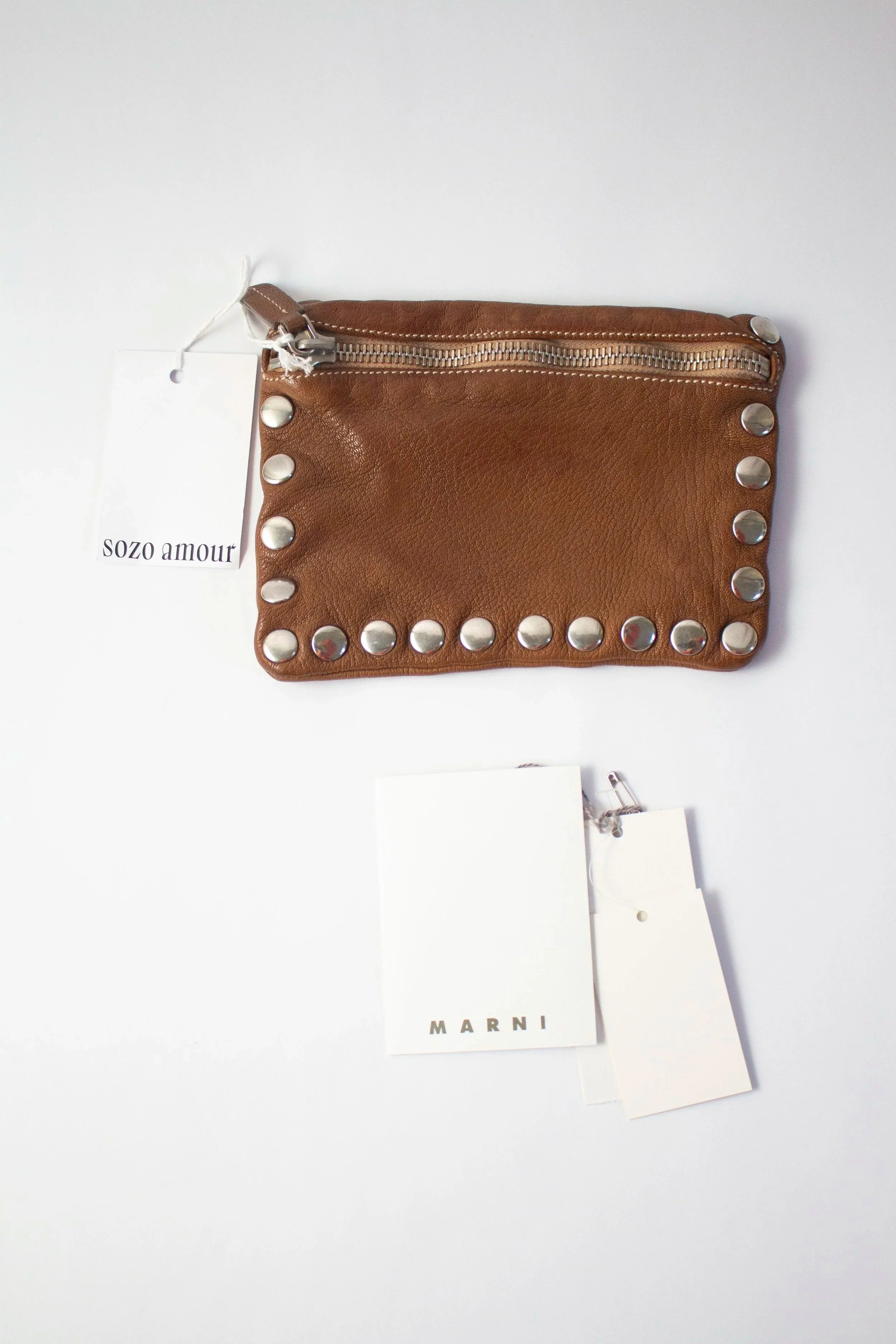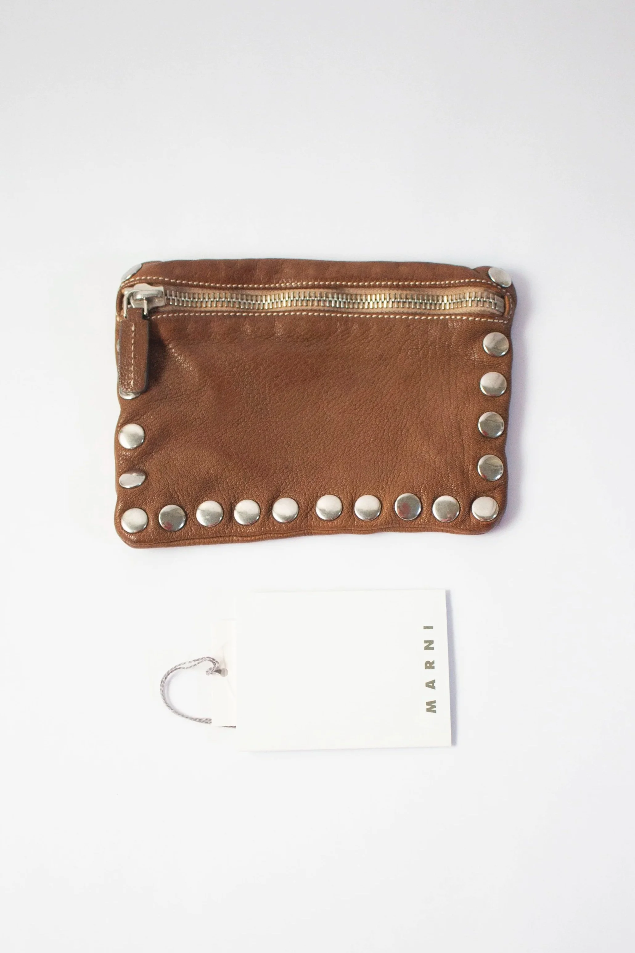 From one of our favourite Marni collections, this leather pouch is a standout from Fall/Winter 2011. Crafted from impeccably soft brown leather, it’s trimmed with silver dome studs that add just the right amount of edge to its minimal silhouette. Though small in size, the quality is unmistakable, a perfect reflection of Marni’s commitment to material and form. Ideal for all of your small essentials, this is a refined everyday piece with archival weight. Great vintage condition, minor marks, tags included.