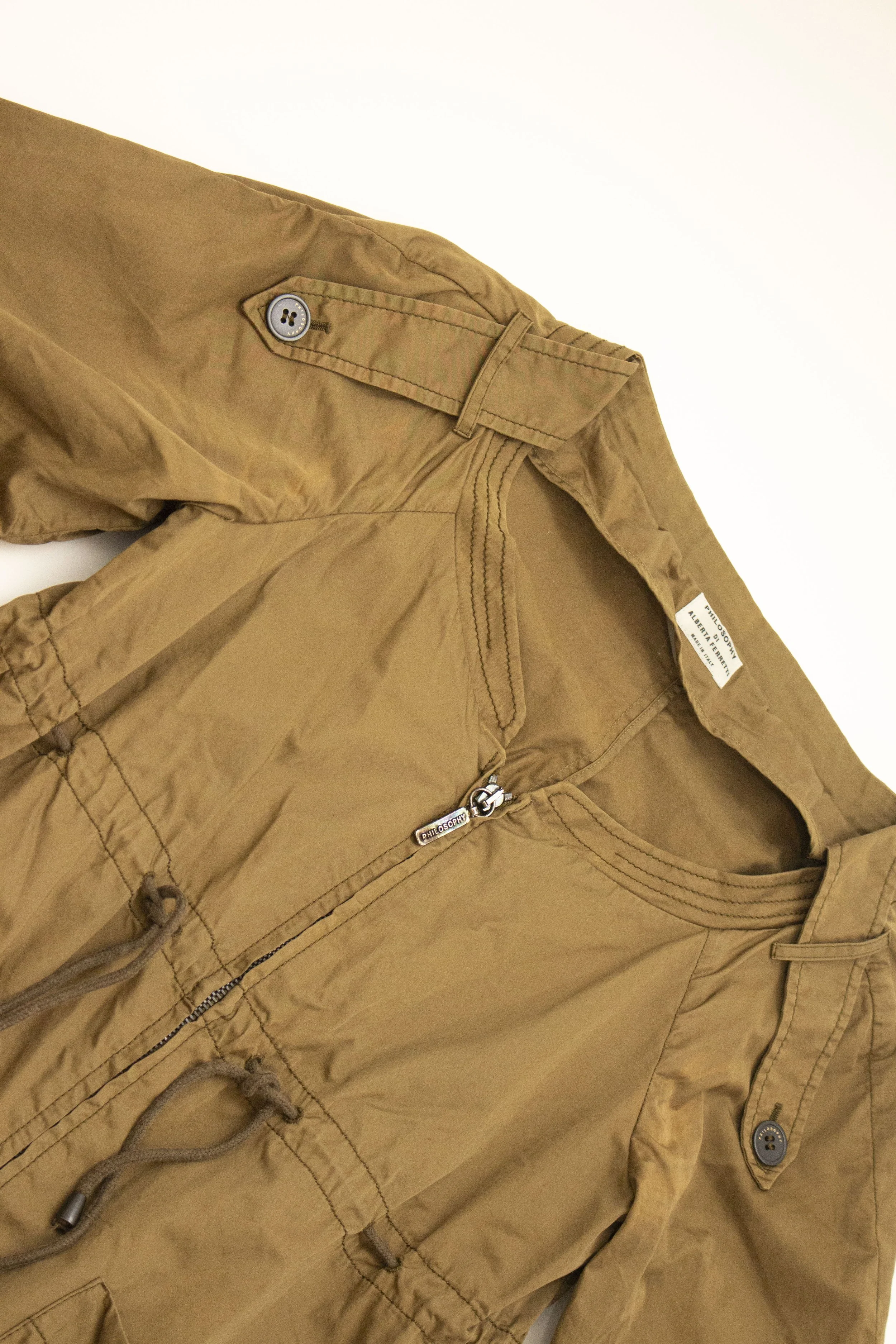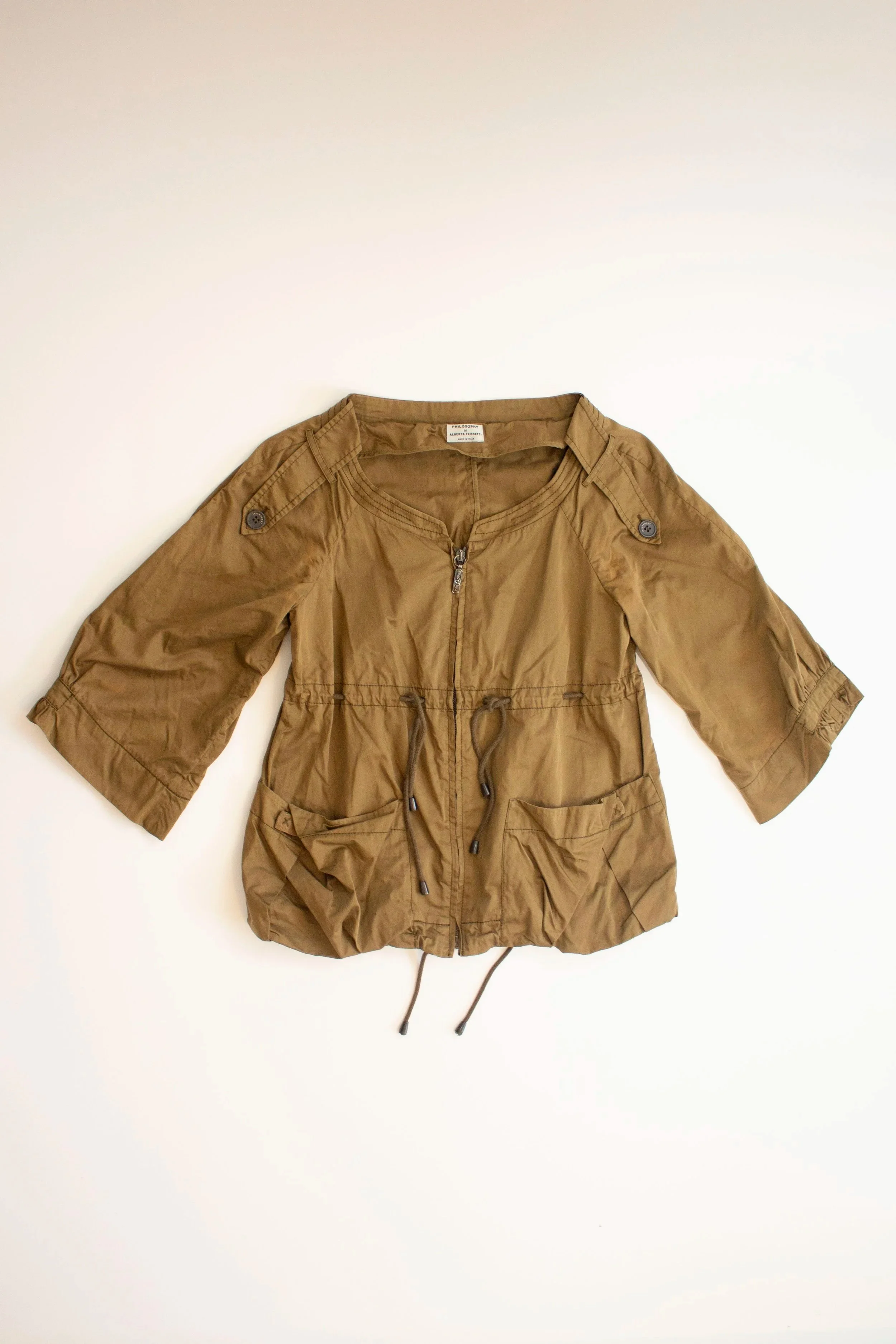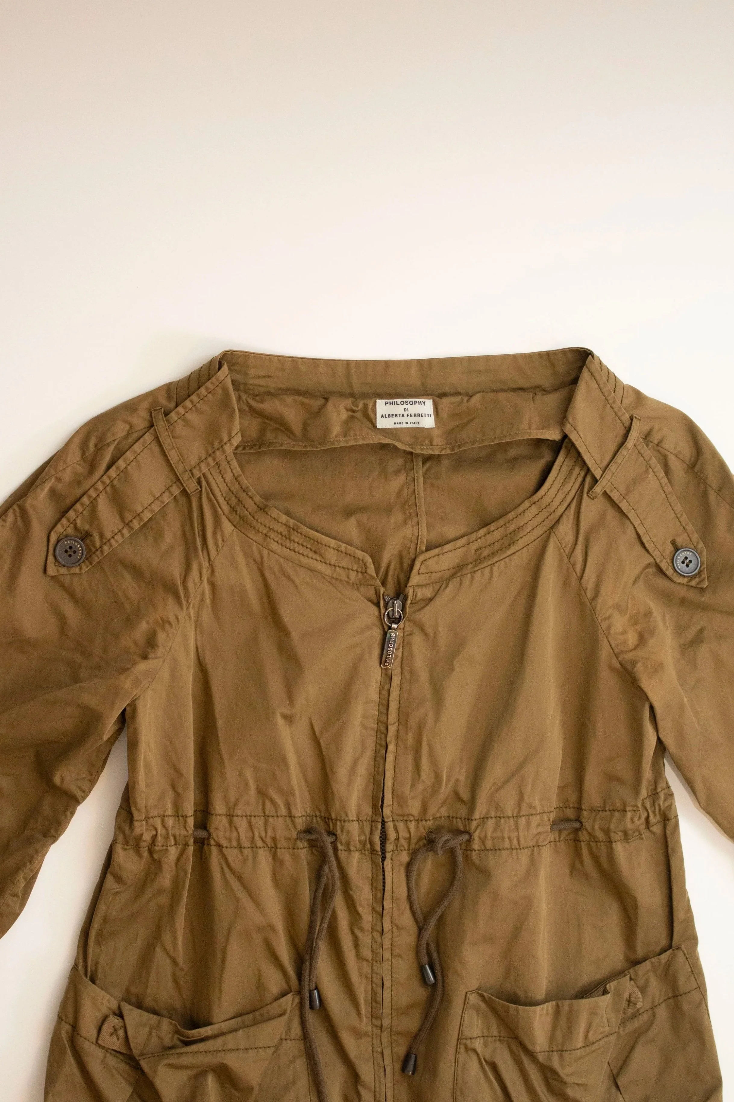 Khaki brown cotton jacket from Philosophy Di Alberta Ferretti, Spring/Summer 2006. Cinched at the waist with drawstring detail, featuring utility-inspired pockets and soft volume through the body. The neckline falls into a very flattering shape on the décolleté, balancing structure with ease. In great vintage condition, some minor signs of wear.